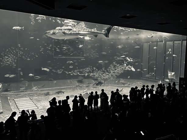 巨大な水槽を悠々と泳ぐジンベイザメに、皆さん大興奮!