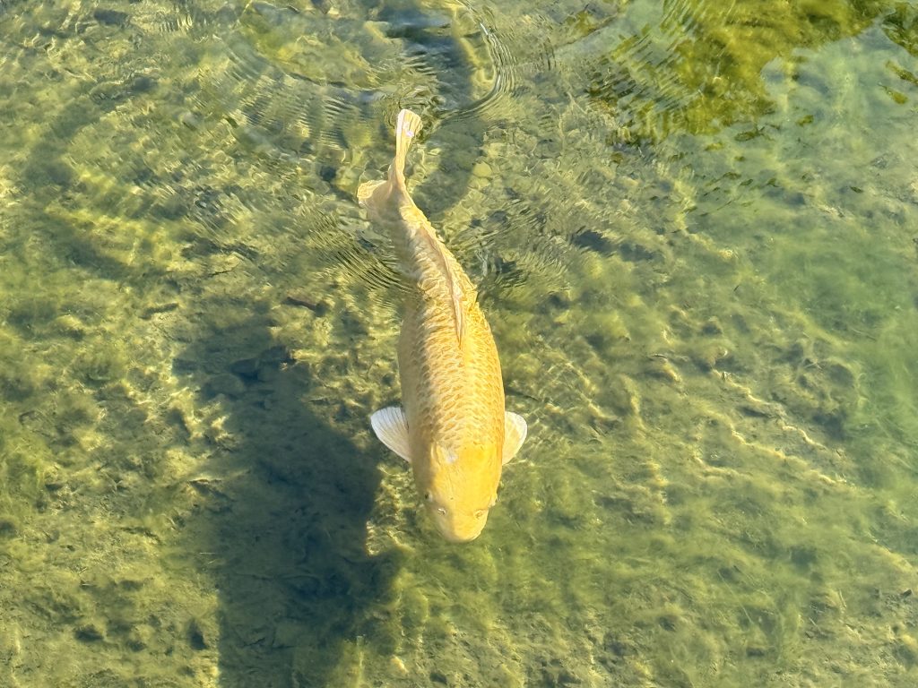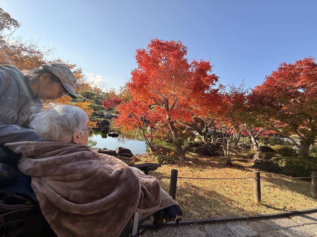 メタセコイヤだけでなく、日本庭園の紅葉もとてもきれいでした。少し肌寒いので、毛布でモコモコになりながらのお散歩です。庭園の池にはなんと黄金に輝く鯉が!