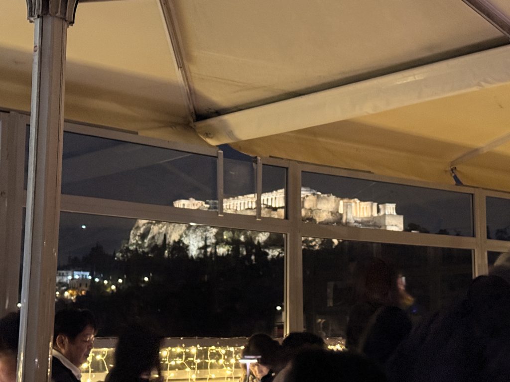夜ごはんもライトアップされたパルテノン神殿を見ながら頂きました。